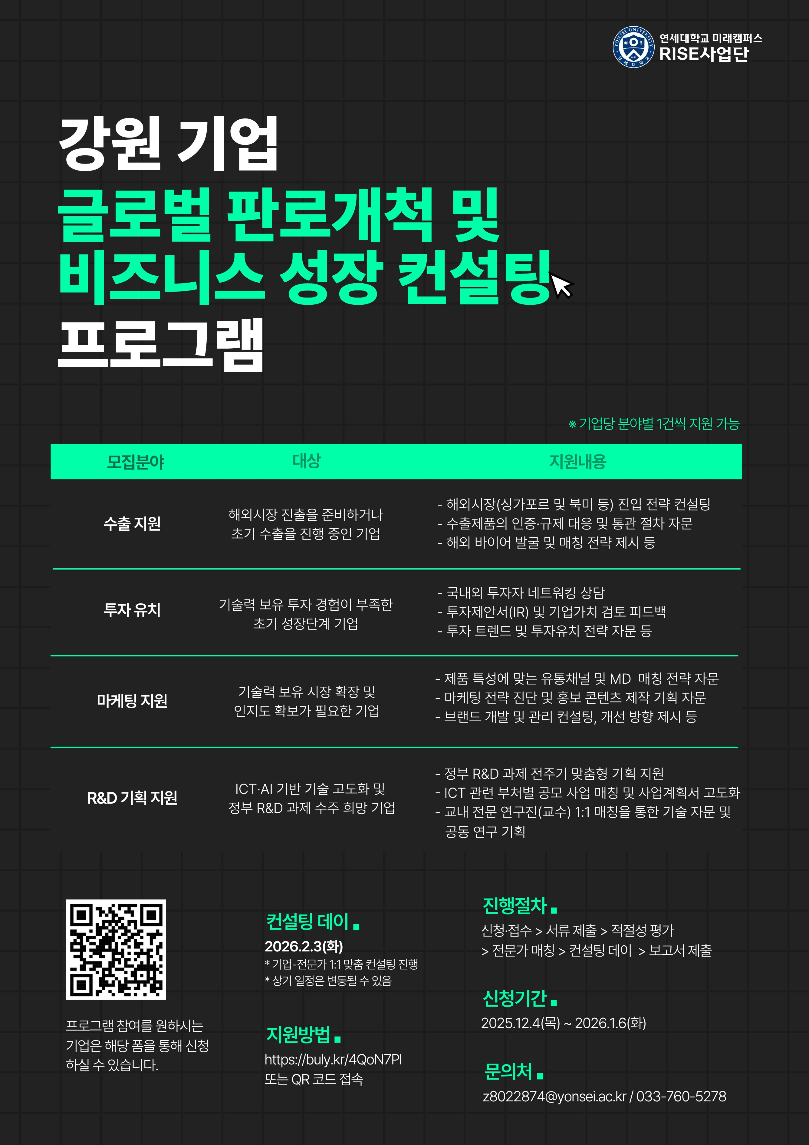 연세대학교 미래캠퍼스 RISE사업단에서는 강원 지역 내 기업 수요 기반 수출, 투자, 마케팅, R&D 기획 분야의 컨설팅 제공을 통한 전주기 지원 체계 구축 및