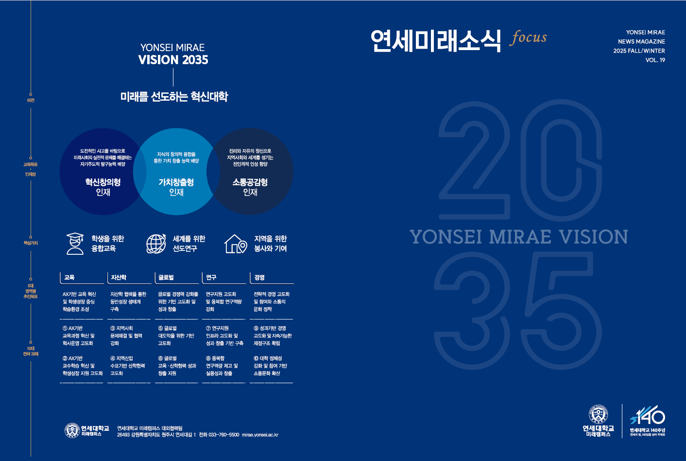 2025-2학기 캠퍼스 주요 뉴스에는 YONSEI MIRAE VISION 2035 수립, RISE사업단 발대식, 대학혁신지원사업 영역별 포럼, 4단계 BK21 대학원 혁신 성과 공유회, 우리 캠퍼스 행정조직 개편, 2025년 제1차 ‘강원지역대학 총장협의회’ 개최, 태국 출라브혼 왕립학원과 공동 세미나·MOU 체결, 법무부 ‘K-STAR’ 비자트랙 선정, 원주박물관 특별전 ‘不朽之緣 - 돌아온 원주문화유산’, KOICA 모잠비크 보건 고위직 공무원 초청 연수, 문형배 전 헌법재판소장 권한대행 RC명사특강, 엔비디아와 ‘RTX AI PC 캠퍼스 세미나’, 국내 대학 최초 ISO 45001·14001 동시 취득, 연세예술원 〈림시교원〉 키프로스 국제영화제 3관왕, 의료 AI 솔루션 오프라인 경진대회, 2025 퇴임 교수의 날, 겨울방학 연세 머레이 캠프 출정식, 캠퍼스에서 즐기는 클래식 공연-연세콘서트시리즈 소식이 실렸다.